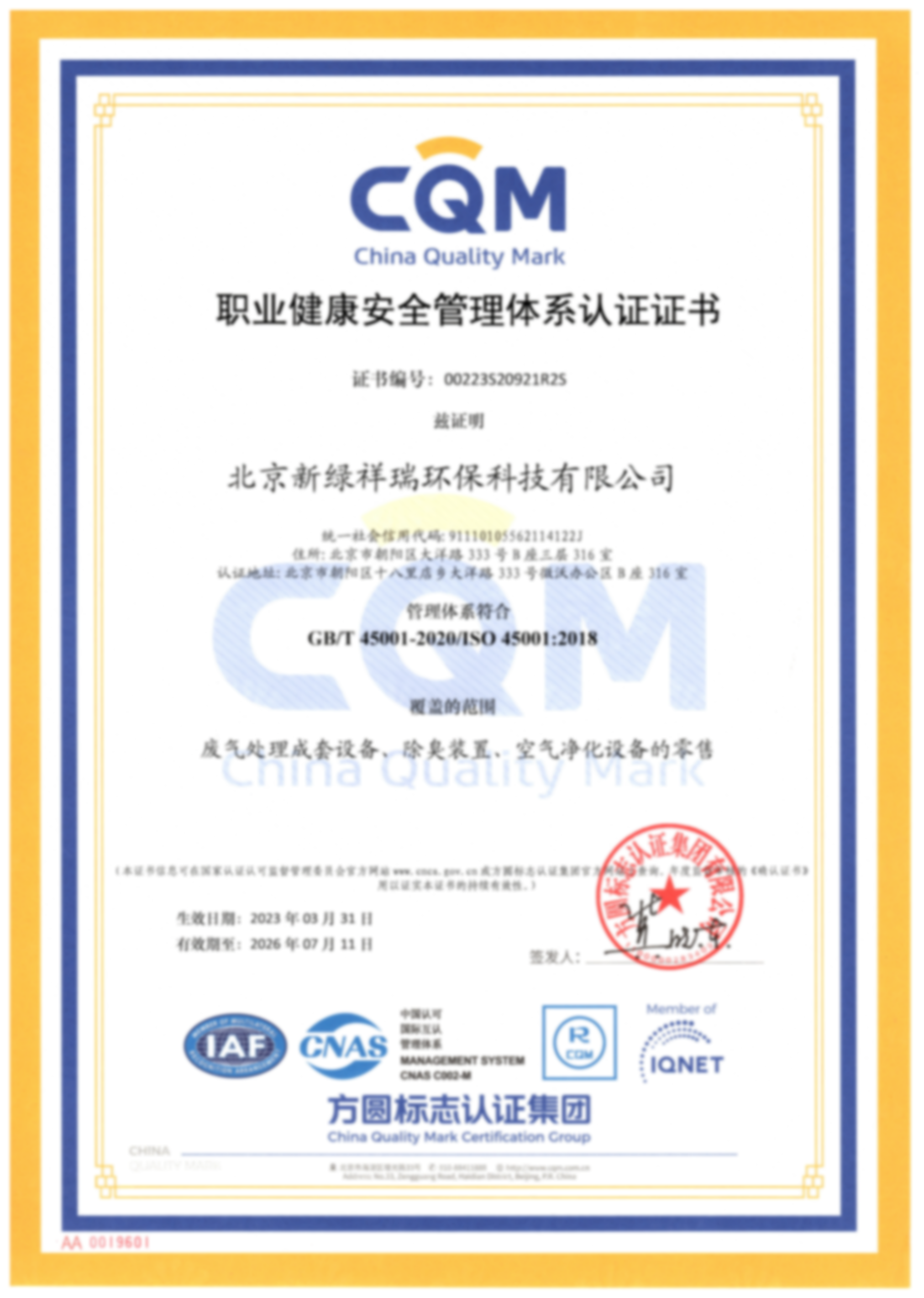 環(huán)境管理體系證書